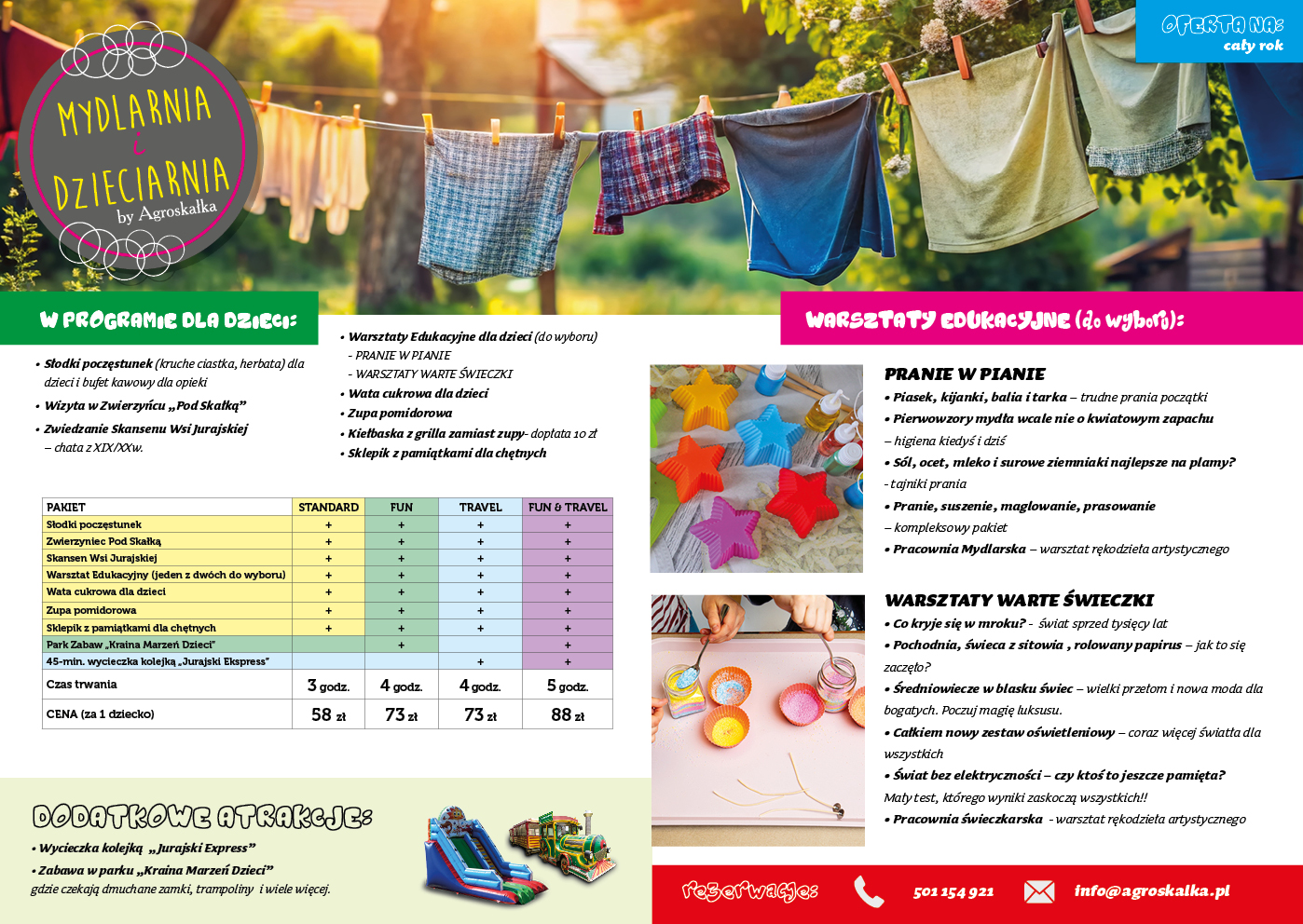 1. Zapraszamy dzieci na niezwykłą podróż w czasie i przestrzeni podczas warsztatu edukacyjnego „Pranie w Pianie”! W tej fascynującej przygodzie mali uczestnicy odkryją, jak wyglądały początki prania przed erą nowoczesnych detergentów. Z pomocą piasku, kijanek, balii i tarki, będą mieli okazję poznać trudności związane z dawnymi metodami usuwania plam.W trakcie warsztatu dzieci zrozumieją, jak zmieniała się higiena na przestrzeni wieków – dowiedzą się, że pierwowzory mydła nie miały zapachu kwiatów, lecz były skutecznymi środkami czystości. Odkryją również, jak niezwykłe składniki, takie jak sól, ocet, mleko i surowe ziemniaki, wykorzystywano w przeszłości do usuwania uporczywych plam.Nasze zajęcia obejmują cały cykl prania – od prania, przez suszenie, aż po maglowanie i prasowanie. To doskonała okazja, by poznać historyczne techniki i zrozumieć, jak ważna była dbałość o czystość w różnych epokach.Na zakończenie warsztatu dzieci przeniosą się do Pracowni Mydlarskiej, gdzie samodzielnie stworzą swoje własne mydło, rozwijając swoje umiejętności rękodzielnicze i artystyczne. „Pranie w Pianie” to nie tylko nauka, ale również kreatywna zabawa, która pobudzi wyobraźnię i nauczy dzieci wartości tradycyjnych umiejętności. To doskonała propozycja dla nauczycieli przedszkoli i szkół podstawowych, którzy pragną wzbogacić swoje zajęcia o interaktywne i edukacyjne doświadczenia.
